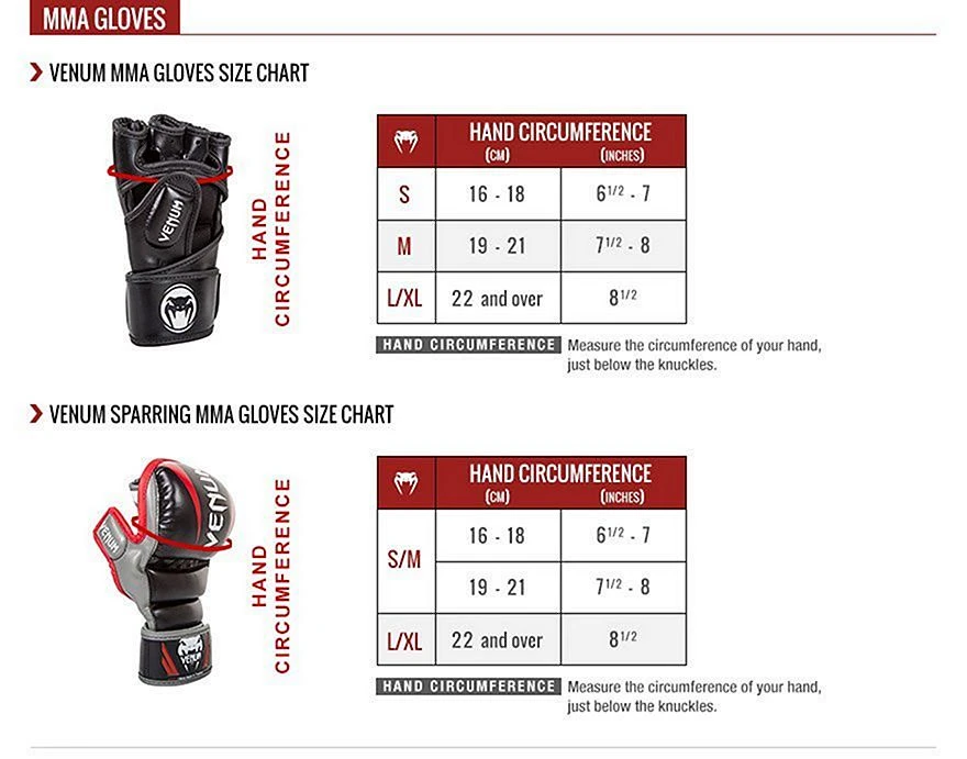 Misure consigliate da Venum (altezza in cm e peso in kg):